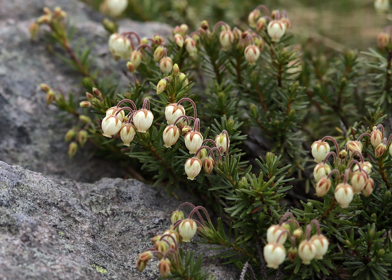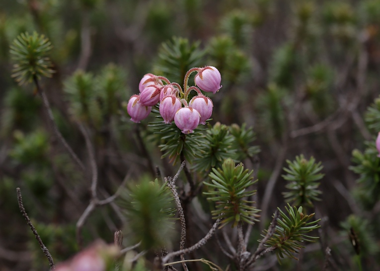コエゾツガザクラ(小蝦夷栂桜) ツツジ科 エゾノツガザクラとアオノツガザクラとの雑種と推定され、花冠の外面はほぼ無毛。 エゾノツガザクラの花冠の表面には腺毛があり、無毛で花色がしぼりになるのはニシキツガザクラとなるようです。 (私的にはお花の色が淡くてふっくらしているとコエゾノツガザクラってことになるのですが・・) |